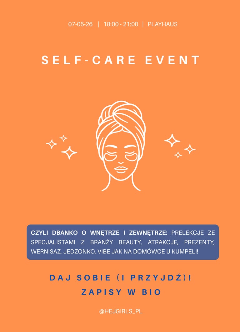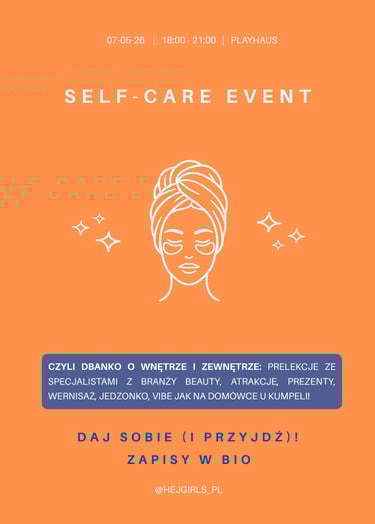 Czym byłoby HejGirls bez self-carowego eventu! W końcu "daj sobie" nie oznacza nic innego, jak właśnie zadbanie o siebie od środka i z zewnątrz. Jak zwykle możecie spodziewać się mnóstwa atrakcji, od prelekcji ze specjalistami z branży beauty, po kosmetyczne zajęcia, mini wernisaż, i wiele innych atrakcji. Dajmy sobie self-care!