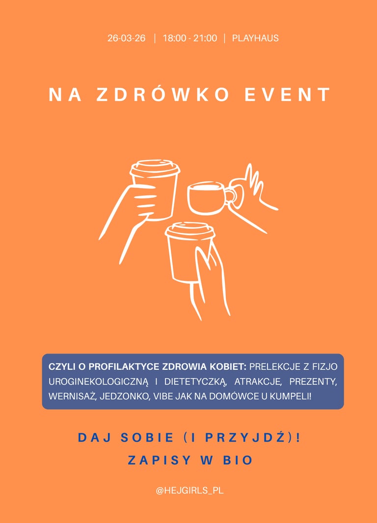 Czas na odgruzowanie po zimie i wejście z przytupem w wiosnę. Zapraszamy Was na HejGirlsowe pogadanki o profilaktyce naszego zdrówka, bo bez zdrówka i dobrych koleżanek nie ma nic. Jak zwykle możecie spodziewać się mnóstwa atrakcji, od prelekcji fizjo uroginekologicznej, po analizę składu ciała, mini wernisaż, kolorowanki i wiele innych. Dajmy sobie profilaktykę!